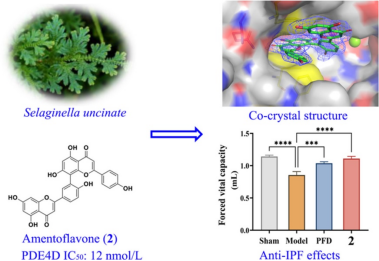 特发性肺纤维化IPF是一种病因不明的纤维化间质性肺病,且随着新冠肺炎的大流行IPF患者人数明显增加,尚无理想治疗药物。磷酸二酯酶PDE4是一个非常有潜力的抗IPF靶标,其现有抑制剂普遍存在呕吐等副作用影响了临床应用,因此开发更安全、有效的PDE4抑制剂作为新型抗IPF药物具有重要的意义,而结构新颖的天然PDE4抑制剂被证明有相对较高的安全性。团队综合应用天然药物化学、结构生物学、药理学等多学科的技术手段,从翠云草中发现了一系列对PDE4具有抑制活性的双黄酮类化合物,其中化合物穗花杉双黄酮(2)对PDE4抑制IC50达到了12 nM,共晶结构显示化合物2与现有药物具有不同的结合模式,其与靶标PDE4之间存在一个强的氢键网络,且在体内外药理模型中都证实化合物2具有显著的抗肺纤维药效。穗花杉双黄酮作为一个广泛研究的天然产物,具有安全性高等优点,但其作用靶标尚不明确。本研究证实穗花杉双黄酮能高活性作用于靶标PDE4,具有开发为新型抗IPF药物的良好潜力。