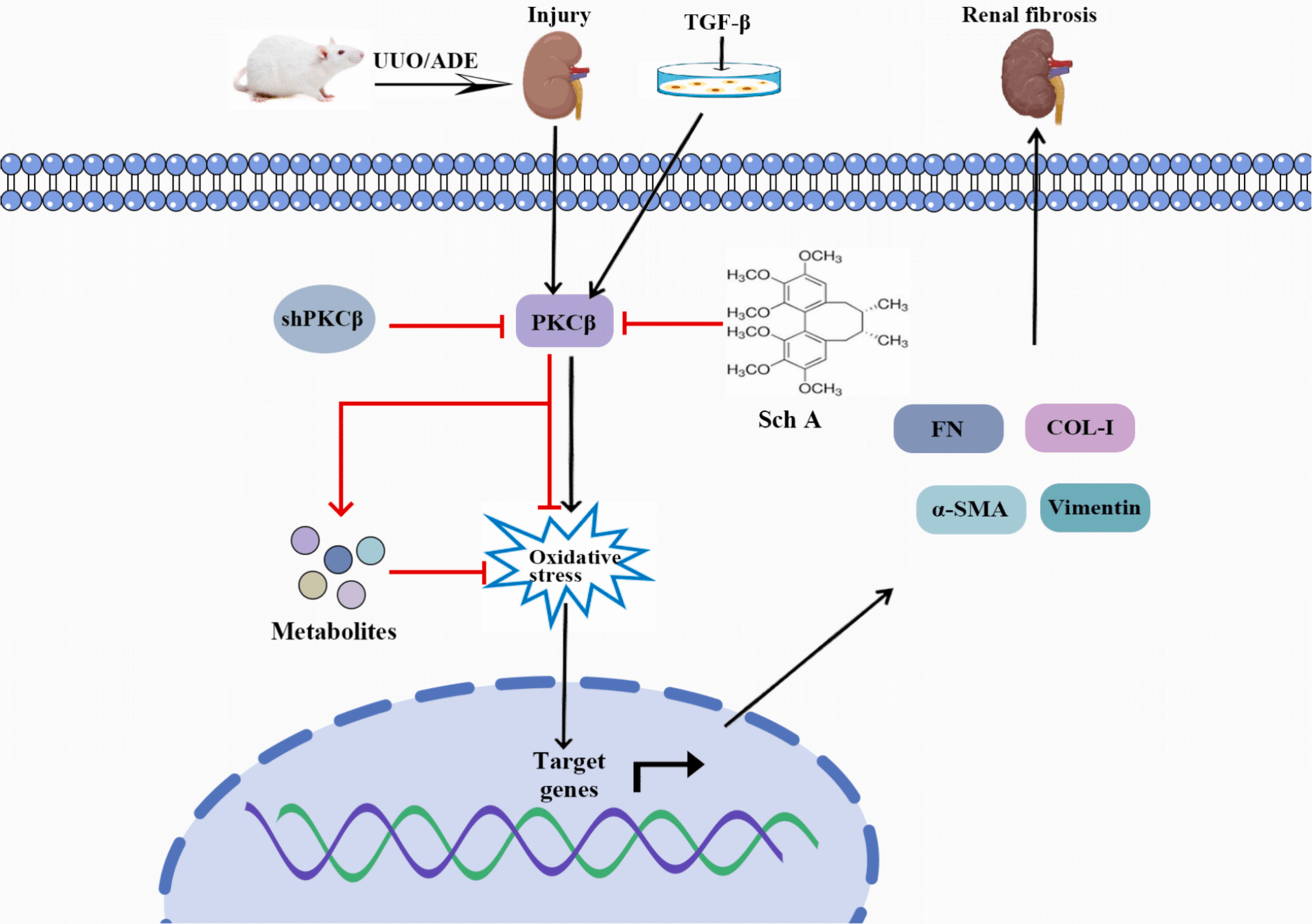 PKCβ是蛋白激酶C家族的一个成员,在癌症、阿尔茨海默病和糖尿病中起着重要调节作用。有研究表明,PKCβ特异性抑制剂可以改善UUO小鼠诱导的肾损伤。我们通过转录组学技术分析发现PKCβ在UUO小鼠肾脏组织显著上调。肾脏特异性敲低PKCβ显著改善了UUO和ADE模型诱导的肾脏纤维化并抑制氧化应激的水平。通过血清代谢组学技术发现敲低PKCβ可以上调潜在抗氧化代谢物1,5-AG、牛磺酸和β-羟基丙酮酸等的水平。我们发现中药五味子中的主要活性成分五味子甲素可以通过抑制PKCβ的表达和抑制氧化应激的水平从而改善UUO诱导的肾脏纤维化。并且,体外过表达PKCβ部分消除了五味子甲素的药理作用,表明PKCβ是五味子甲素抗肾纤维化和抗氧化作用的关键蛋白。该论文绅士漫画