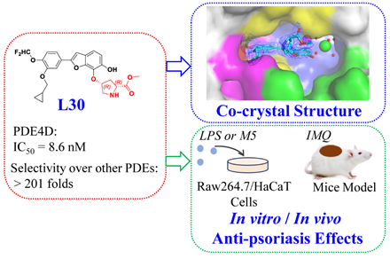 银屑病(psoriasis)是一种慢性、复发性的炎症性皮肤疾病,俗称“牛皮癣”,常表现为局限或广泛分布的鳞屑性红斑或斑块,严重影响患者的生活质量。目前,银屑病还无法治愈;PDE4抑制剂是近年来银屑病治疗领域备受关注的一类靶向药物,但存在胃肠道等副作用限制了其临床应用;而结构新颖的天然来源PDE4抑制剂被证明有相对较高的安全性。团队在对传统中药桑白皮的研究中,发现其中的桑辛素M对PDE4具有一定的抑制活性(2.9 µM),并优化获得了系列PDE4先导结构具有抗结肠癌和抗肺纤维化等生物活性(Clin Transl Med 2025; Bioorg Chem 2024)。在进一步的研究中,团队通过共晶结构的指导通过定向引入脯氨酸片段等策略获得了一个PDE4抑制活性、亚型选择性及类药性均衡的先导结构L30,在体外实验中可有效抑制银屑病模型细胞的增殖及炎症因子的释放等,在体内实验中则具有显著的银屑病治疗药效,呈现出良好的开发前景。