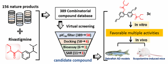 桑志培副教授联合黄姝姮副教授进一步基于多靶点药物设计策略,以156个天然产物为骨架,通过与卡巴拉汀药效团进行拼合,获得了一个虚拟的化合物库,借助机器学习和打分获得了苗头化合物HK-1,进一步优化获得了具有体内外抗AD药效的先导化合物3c。该工作为人工智能驱动的多靶点抑制剂抗AD的发展带来了新的思路。