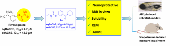 随后,桑志培副教授联合黄姝姮副教授对上市药物卡巴拉汀进行了结构优化,获得了先导化合物6a。6a是一个高效、高选择性的BuChE抑制剂,且具有良好的血脑屏障透过性和显著的体内抗AD药效。