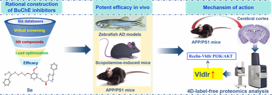 桑志培副教授联合黄姝姮副教授通过广泛的虚拟筛选与先导化合物优化,成功获得了一种新型可逆的选择性BuChE抑制剂——化合物8e,并对其进行了全面的体外和体内评估。体内药效研究表明,8e能够显著改善BuChE过表达的斑马鱼AD模型和AlCl3诱导的斑马鱼AD模型的认知功能障碍。而且,8e显著减缓了东莨菪碱诱导小鼠和APP/PS1转基因小鼠的认知功能障碍。进一步的蛋白组学分析表明,8e发挥抗AD的作用机制与极低密度脂蛋白受体(Vldlr)密切相关。
