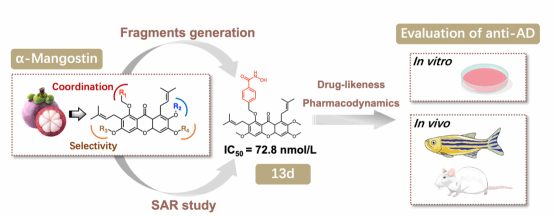 在本研究中,罗海彬教授团队采用人工智能(AI)驱动的创新策略,结合生成式循环神经网络(RNN)化合物设计、虚拟筛选及构效关系(SAR)分析,成功开发出一种高效PDE4抑制剂13d。该化合物以α-倒捻子素为先导结构优化而来,对PDE4表现出强效抑制活性(IC50 = 72.8 nmol/L),并具有适度的肝微粒体代谢稳定性。体外实验表明,13d不仅具有显著的抗炎作用,还展现出良好的神经保护活性。进一步的体内研究证实,13d能显著改善AlCl3诱导的斑马鱼AD模型认知功能障碍,并通过抑制PDE4及降低炎症因子水平发挥治疗作用。此外,在AlCl3/D-半乳糖诱导的AD小鼠模型中,13d也表现出显著的疾病缓解效果。