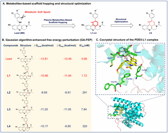 在这项研究中,罗海彬/吴德燕联合研究团队采用基于代谢物的骨架跃迁策略和绝对结合自由能计算,发现了具有良好代谢稳定性的高选择性PDE5抑制剂,并以高立体选择性实现该类化合物的不对称合成。其中,化合物L9显示了最强的PDE5抑制活性(IC50 = 1.03±0.03 nmol/L)和高选择性(≥898倍),口服生物利用度为47.2%。在博莱霉素诱导的IPF小鼠模型中,口服L9·HCl (5.0 mg/kg)的抗肺纤维化作用优于对照化合物吡非尼酮(150 mg/kg),表明L9·HCl是治疗IPF的潜在先导物。