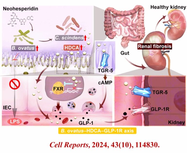 课题组首次发现小鼠定殖卵形拟杆菌(B.ovatus)后具有改善CKD和肾纤维化的作用。机制研究发现,B.ovatus能够促进肠道闪烁梭菌(C. scindens)的生长, 而C. scindens能够直接在肠道中产生活性内源性分子猪去氧胆酸(HDCA)。HDCA能够显著下调肠道FXR,上调肠道TGR5的蛋白表达,进而促进肠道L细胞分泌GLP-1。GLP-1通过血液循环到达肾脏激活GLP-1R发挥肾脏保护作用。此外,我们通过筛选发现天然产物新橙皮苷(NHP)通过促进B.ovatus的生长来发挥其抗肾纤维化作用。该论文绅士漫画