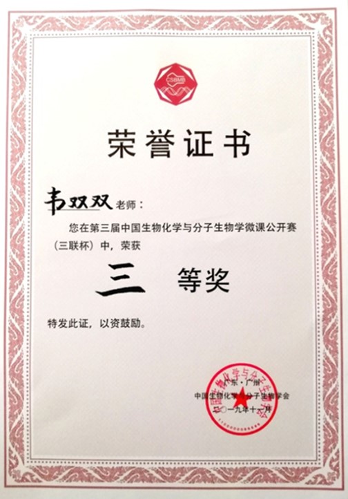 生物化学与分子生物学是生命科学和生物医学等学科的核心专业。为促进教学理念、思路、设计和方法的创新实践与交流,提高各高等院校的专业教学水平,中国生物化学与分子生物学会教学专业分会于2019年11月22-25日在广东广州举办“第三届中国生物化学与分子生物学微课公开赛(三联杯)暨第二届优秀教师训练营”。各省级生物化学与分子生物学会推荐1名教师参加竞赛,经过一天的激烈角逐,绅士漫画 韦双双老师获得此次大赛三等奖。