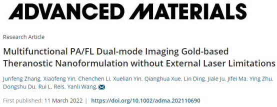 Junfeng Zhang et al. Multifunctional PA/FL Dual-mode Imaging Gold-based Theranostic Nanoformulation without External Laser Limitations. Advanced Materials. 2022, 2110690. //doi.org/10.1002/adma.202110690