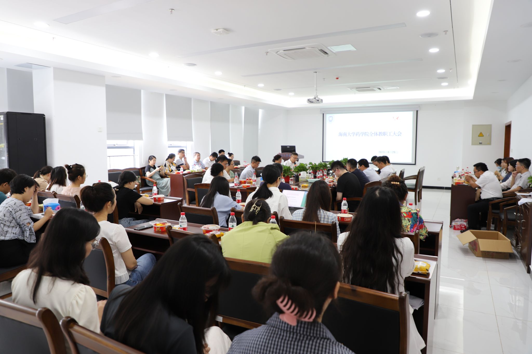在海口新药谷药学大楼515会议室召开新学期全体教职工大会,传达学校暑期工作会议精神。会议由学院党总支书记胡静主持,院长罗海彬、副院长黄玲、宋彦廷和六十余名教职工参加。