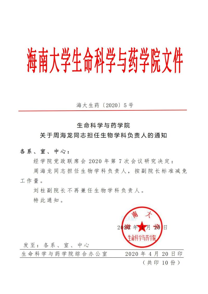 《生命科学与绅士漫画 关于周海龙同志担任生物学科负责人的通知》(海大生药[2020]5号))