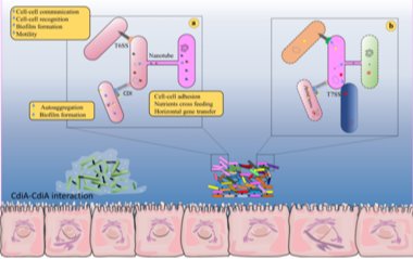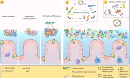 该文通过对包括接触依赖性抑制(CDI)、纳米管、VI型分泌系统(T6SS)以及膜囊(MVs)等胞外细胞器分子机制的综合分析,发现肠道菌群不同细菌之间可通过化学通讯(如群体感应)等分子交易进行着互利或互害的分子合作与分子竞争。该文的发表可望为肠道菌群不同细菌之间的分子通讯、互作与竞争提供一点研究思路、观点和借鉴。