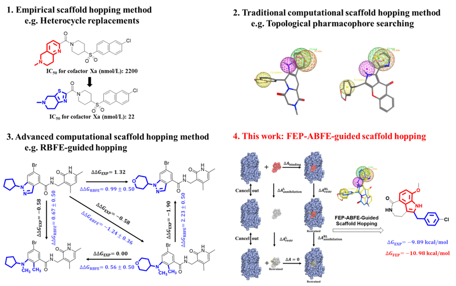 靶向药物设计与发现团队利用自主发展的基于自由能微绕(FEP,Free Energy Perturbation)的药物设计方法并结合药物设计基本理论,成功发展了一种基于自由能微扰的“骨架跃迁”新方法。该方法具有较高的成功率,可为新骨架先导结构的发现提供理论指导与技术支撑。