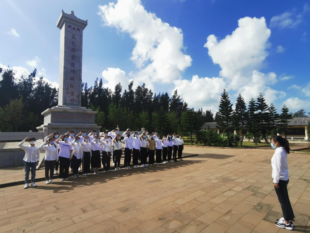 秋风拂面,碧空如洗,澄迈县桥头镇玉包港的悬崖下波涛翻滚,悬崖岸上苍翠的松柏环绕着一座耸天的纪念碑,碑的正面自上而下镌刻着几个大字“玉包港登陆作战纪念碑”。在纪念碑前全体党员为逝世的革命先烈们默哀追思。谢天宇老师结合中国人民解放军渡海部队冒着敌机的狂轰乱炸挺进玉包港强行登陆的作战历史,给大家生动讲述了解放海南岛战役的英勇壮烈和深刻诠释共产党革命的无畏精神。在场全体党员认真聆听,肃然起敬。