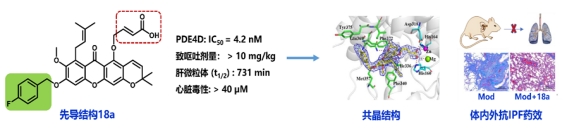 靶向药物设计与发现团队及其合作者在对天然产物倒捻子素进行优化后获得了先导结构18a,其是一个选择性高、活性强的PDE4抑制剂(IC50为4.2 nM),且具有高效低毒的优势(体内肺纤维化药效是阳性药物吡非尼酮的15倍,口服安全窗是阳性药物罗氟司特的10倍以上),表明先导结构18a具有开发为新型抗IPF候选药物的良好潜力(图3)。