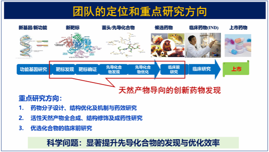 团队通过发展高通量筛选技术与药物靶标发现技术,搭建基于中药资源提取物的样本库及药物筛选平台,开展活性成分研究、全合成研究、结构优化及成药性研究,并在此基础上开展基于多种疾病模型的药效研究、作用机制研究及临床前研究,发现其科学与市场价值。目前已在国内外重要学术刊物J. Med. Chem., Acta Pharm. Sin. B等发表论文30余篇;发明专利12项;主持国家自然科学基金面上项目、国家自然科学基金青年基金、广州市科技重点项目、海南省自然科学基金创新研究团队项目、海南省自然科学基金高层次人才项目等项目9项,科研经费超过500万元。多年来主要从事新药研发工作,已获得一个临床前候选药物(已实现成果转化)。