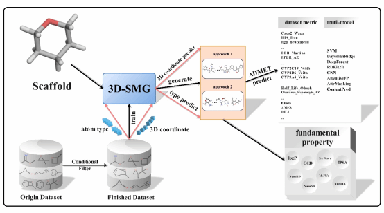 在药物发现的过程中,关键问题之一就是如何从特定结构出发通过结构改造获得更佳生物活性和ADMET性质,也称为结构优化。基于一个起始的核心骨架,使用深度生成模型生成具有所需性质的类药分子,将为加速结构优化过程提供强大工具。为了有效地从特定骨架生成分子,并为结构优化提供基础,该论文提出了3D-SMGE工作,包括分子生成模块与ADMET性质预测模块。对于分子生成模块,论文中使用基于原子类型与空间坐标的3D分子表征方式,提出了用于端到端设计的深度生成模型3D-SMG。在3D-SMG模型中,设计了交叉聚合连续滤波卷积(ca-cfconv),用于实现高效低成本的3D空间特征提取,同时确保了原子空间旋转与平移的不变性。3D-SMG也被证明能够生成有效、独特和新颖的类药分子。此外,论文中提出数据自适应多模型(data-adaptive multi-model)的ADMET预测方法在27个ADMET基准数据集中,其中24个数据集表现优于或保持最佳评估指标结果。